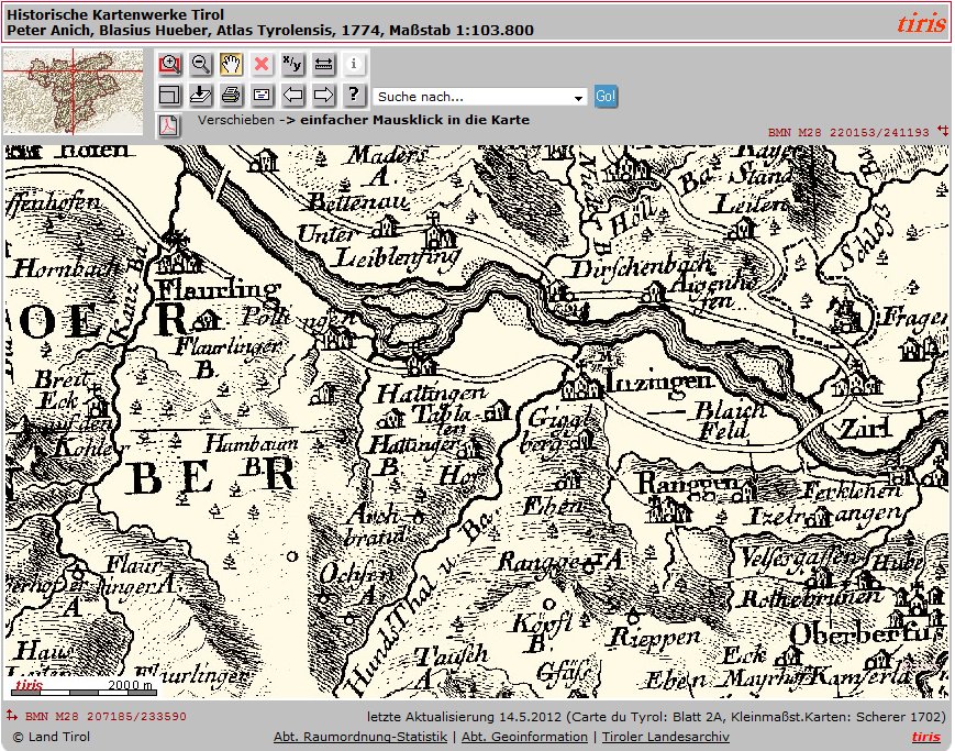 In diesem Bericht wird auf historische Landkarten verwiesen. Die hier gezeigte Karte stammt aus dem Zeitraum 1802/1805. Vorlage für diese Karte dürfte sehr wahrscheinlich die Karte des berühmten Kartographen Peter Anich  gewesen sein, welche etwa ein halbes Jahrhundert früher entstand. Beide Abbildungen stammen von der TIRIS Internetseite der Tiroler Landesregierung.