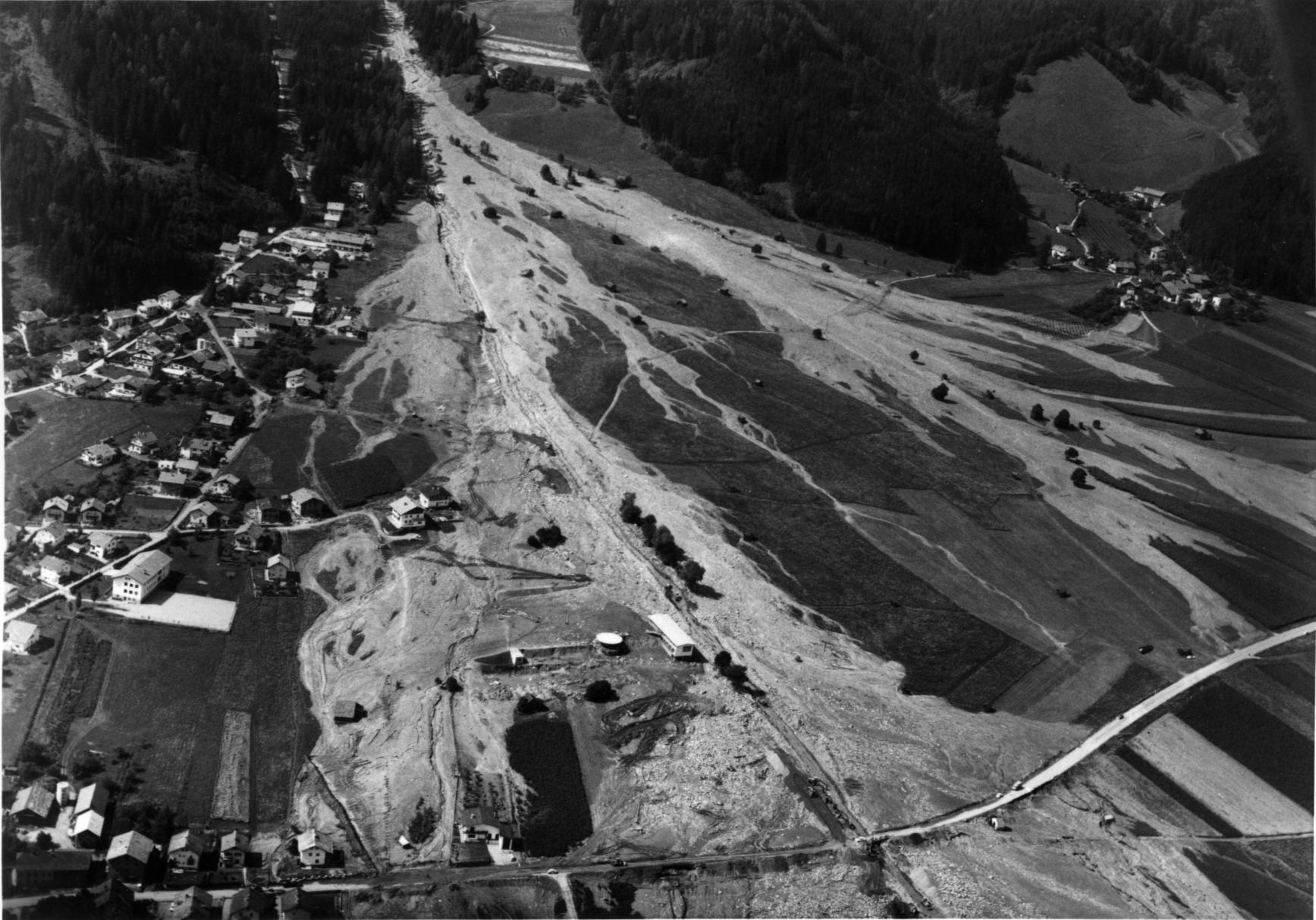 Aus dem Almgebiet hatte die Mure Jungvieh mitgerissen und talwärts geschwemmt. Da, wo die Murmassen aus der Enge in die Weite stürzten, stand die erst kürzlich erbaute Schihütte des Anton Hosp. Die Flut zertrümmerte den Bau und die Bewohner konnten sich nur mit knapper Not retten.