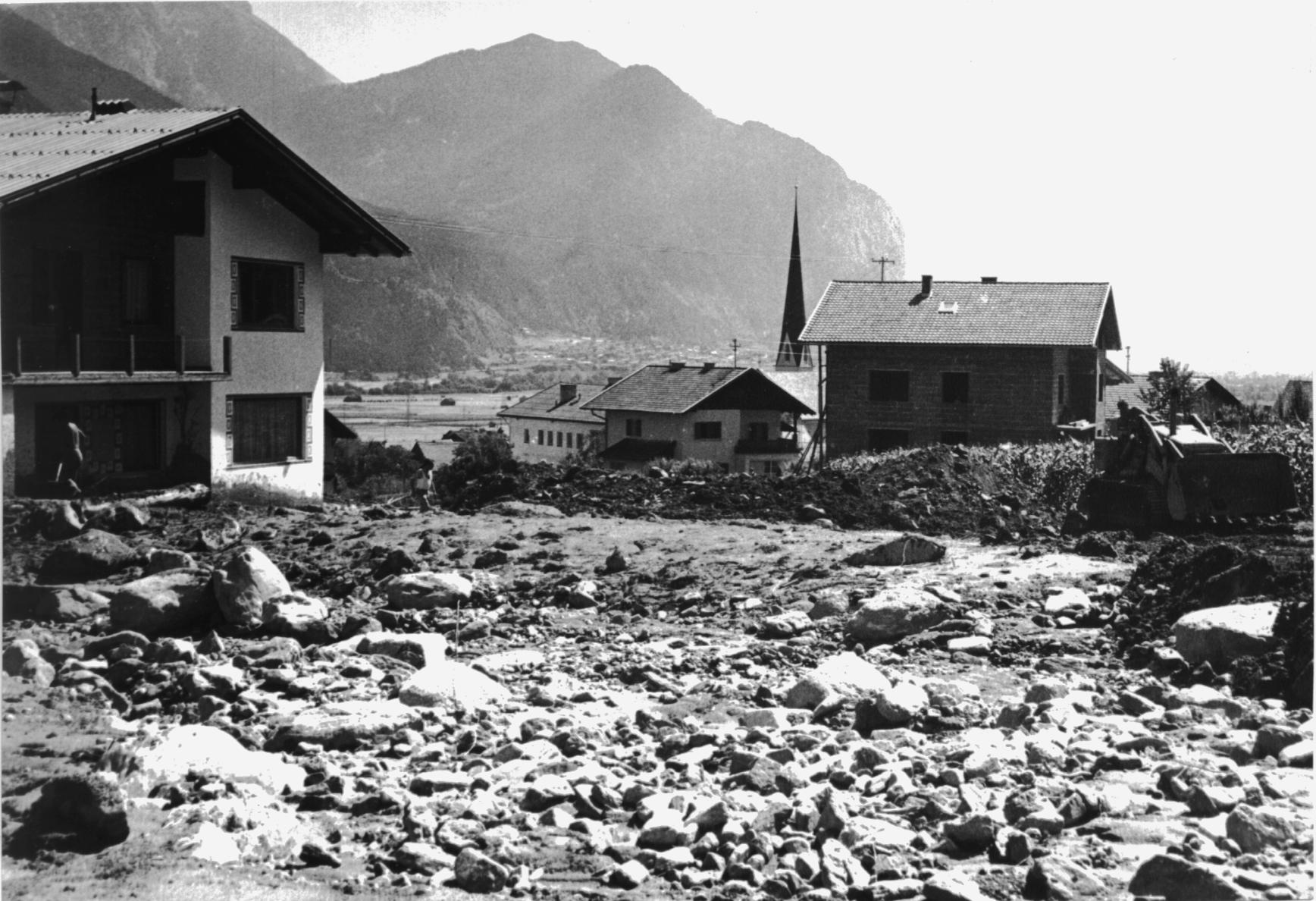 Zur gleichen Zeit wie bei uns hatten auch Flaurling und Oberhofen durch den Kanzingbach Schaden erlitten. In Oberhofen waren rund 50 ha, in Flaurling etwa 10 ha Kulturgrund überschwemmt und versandet, zwei Brücken zerstört, die Bahngeleise verlegt, das Elektrizitätswerk und die Wasserversorgungsanlage stark beschädigt.
